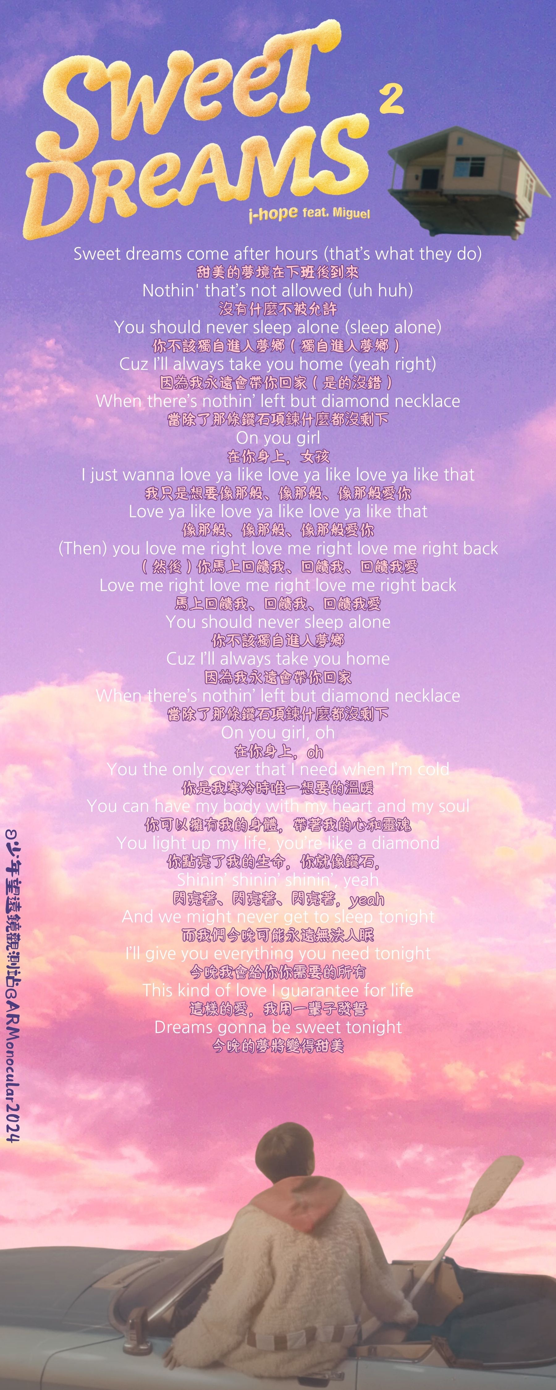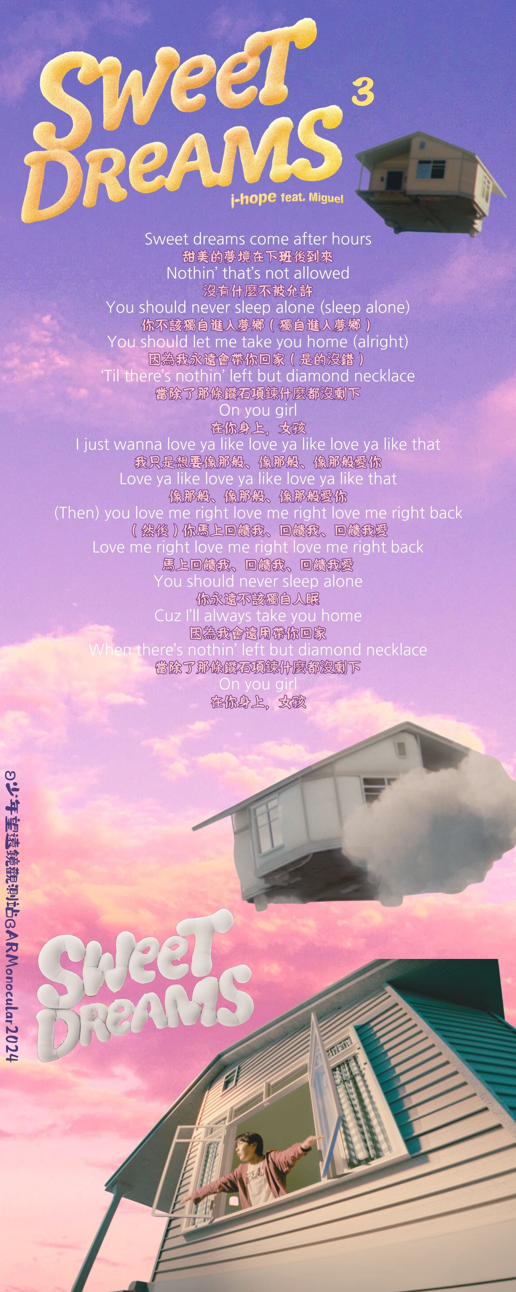 ‘Sweet Dreams (feat. Miguel)’是Pop R&B曲風,帶著真心想愛與被愛的心情所創造的小夜曲。而R&B領域的代表歌手Miguel參與合作也為歌曲添加甜美的音色。和j-hope與Miguel夢幻又甜蜜的碎語一起,也期望聽到歌曲的粉絲們今天能有 “Sweet Dreams” 。